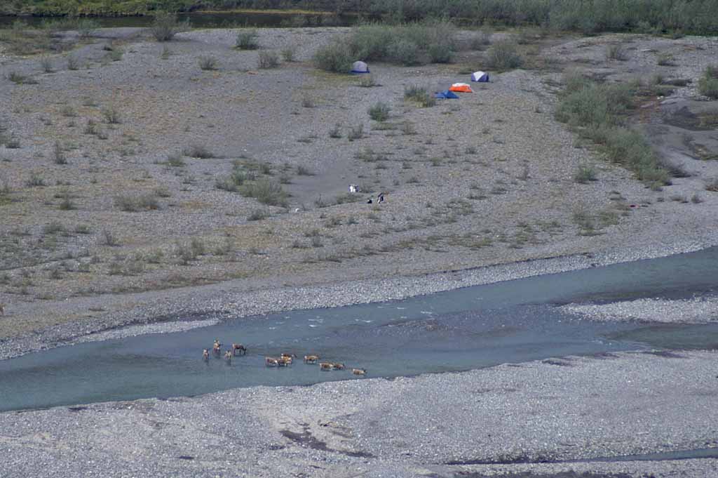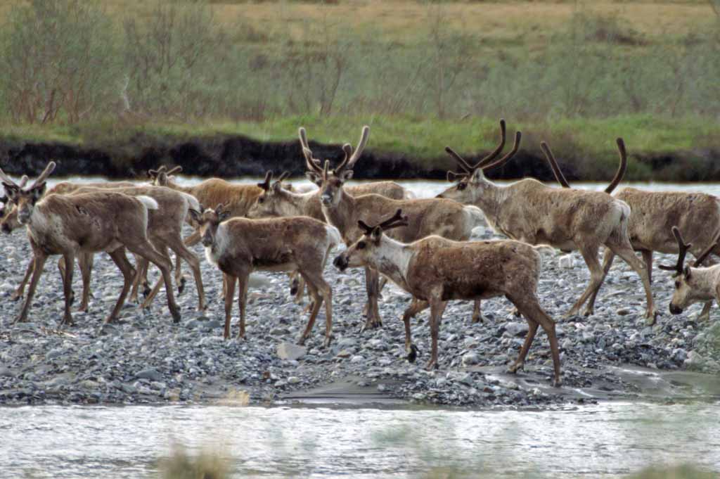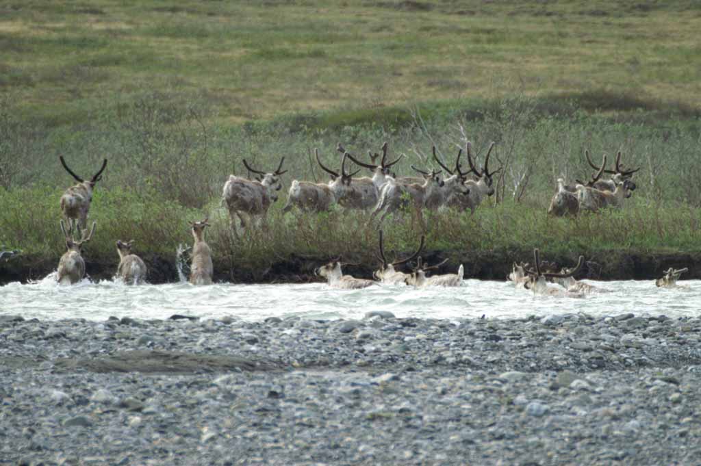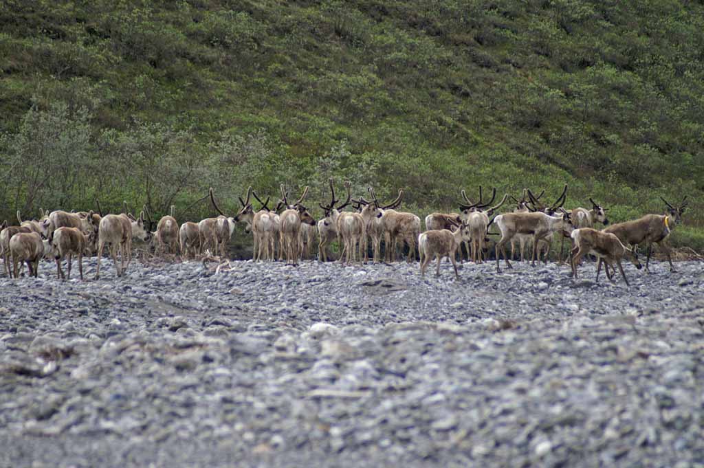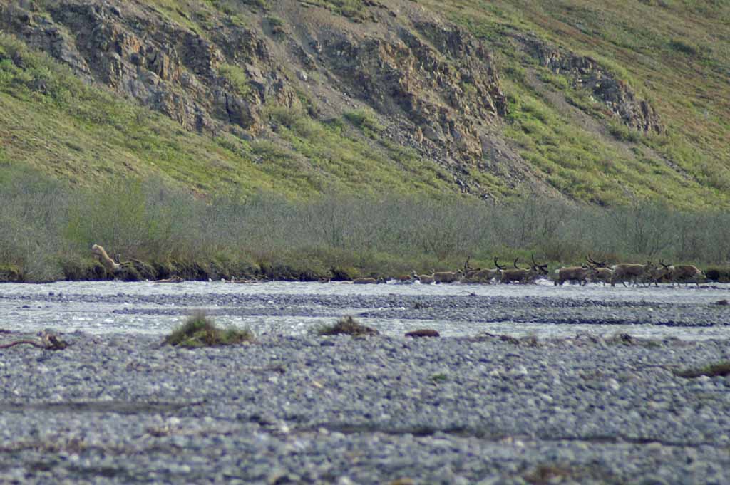the river. A couple of large groups of caribou