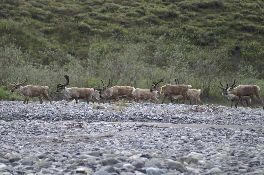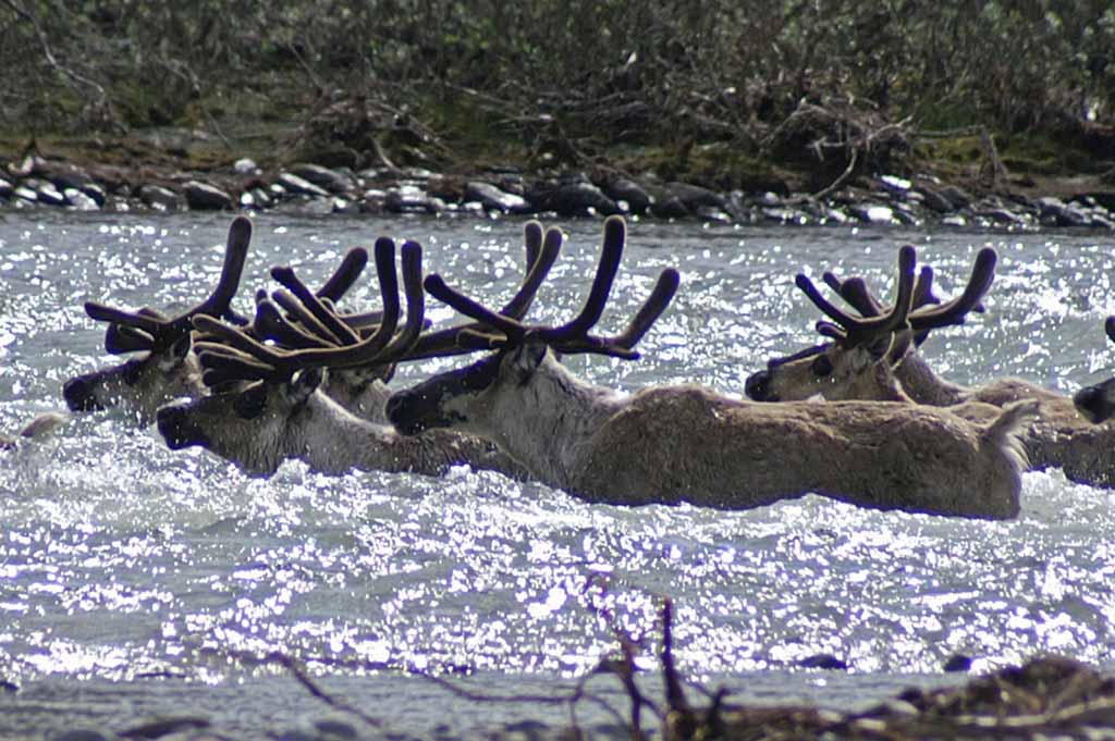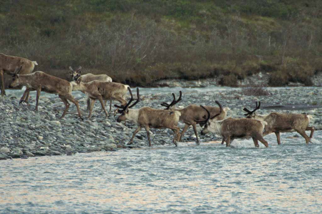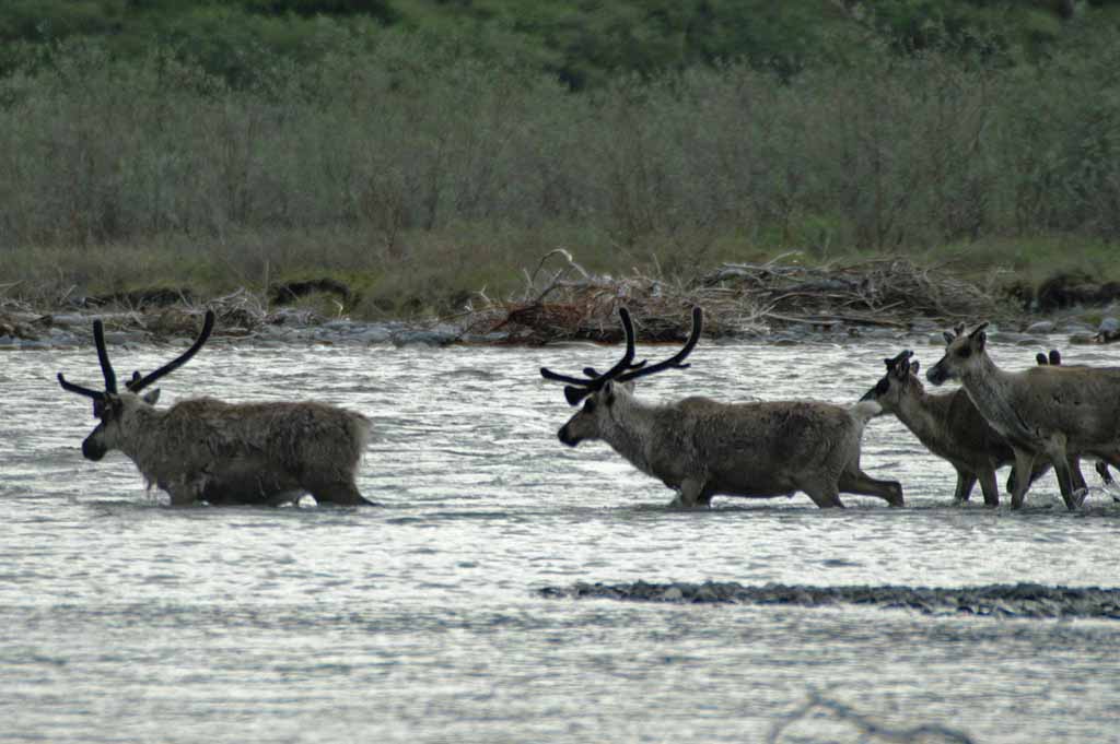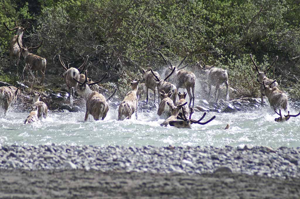 the river. A couple of large groups of caribou