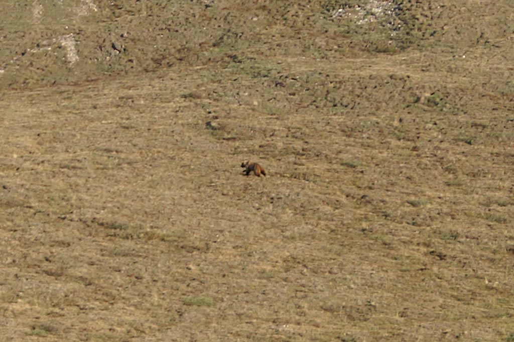tent to get a larger zoom, I see a grizzly on the slope above our camp. Pretty close. And, it’s not the same one we saw