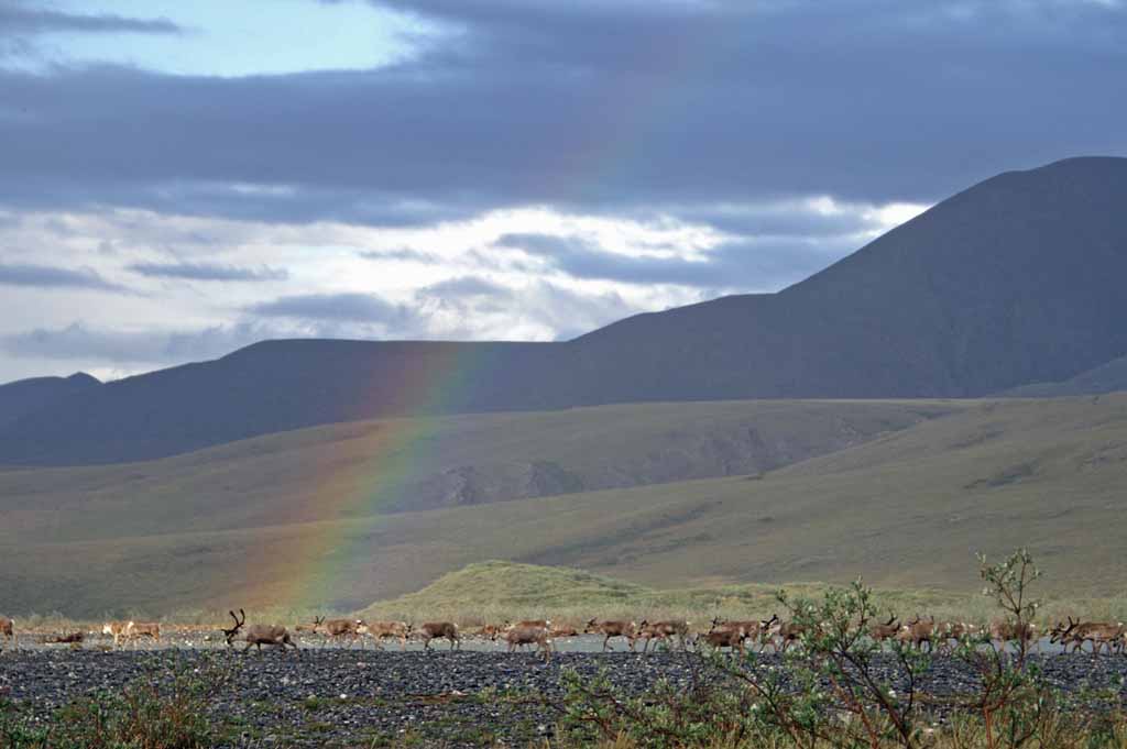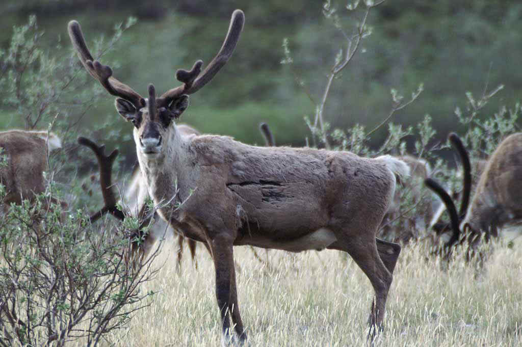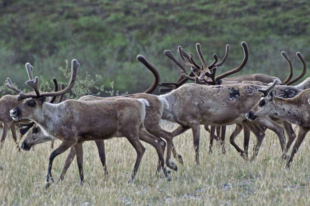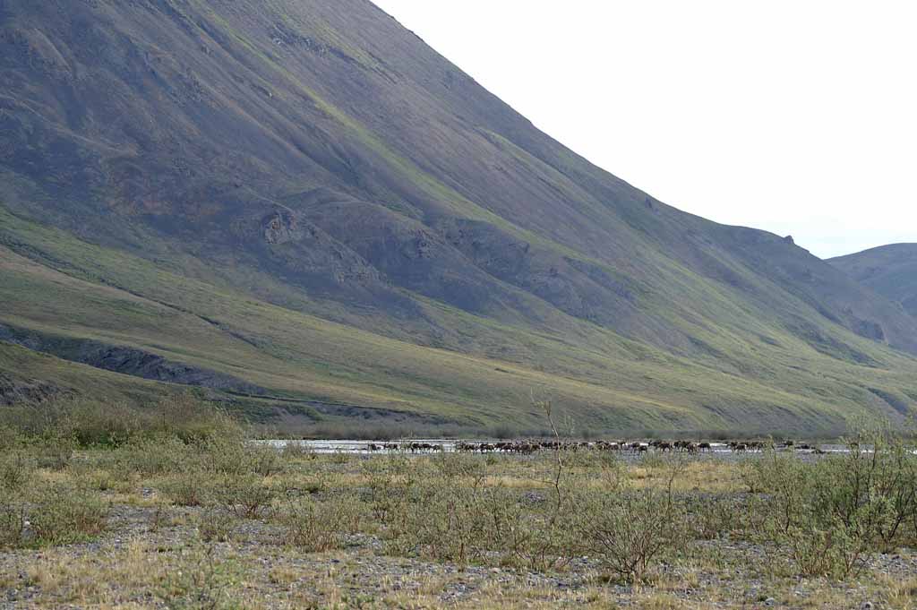 see. There are intermittent groups of caribou wandering on the plain - - no