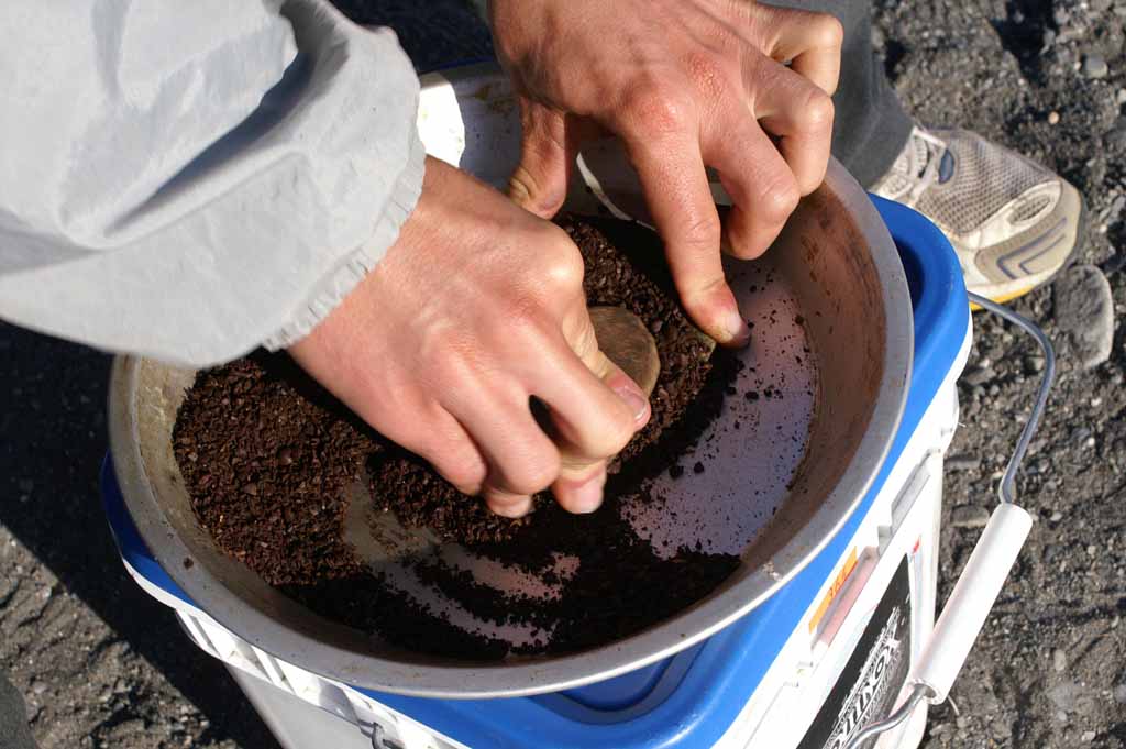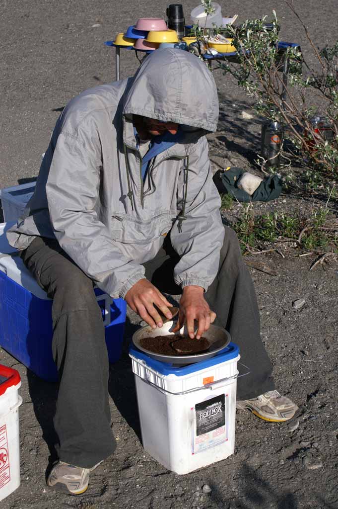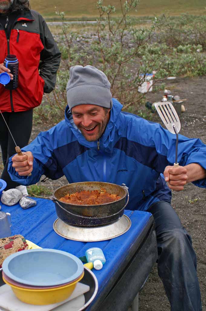 the previous day’s accumulation of grounds. He sets up the dining fly in case the weather turns
