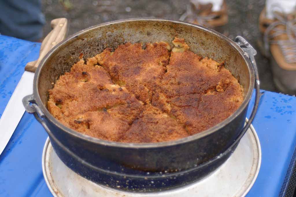 with dinner. The main course is pilaf and for desert he uses a Dutch oven to